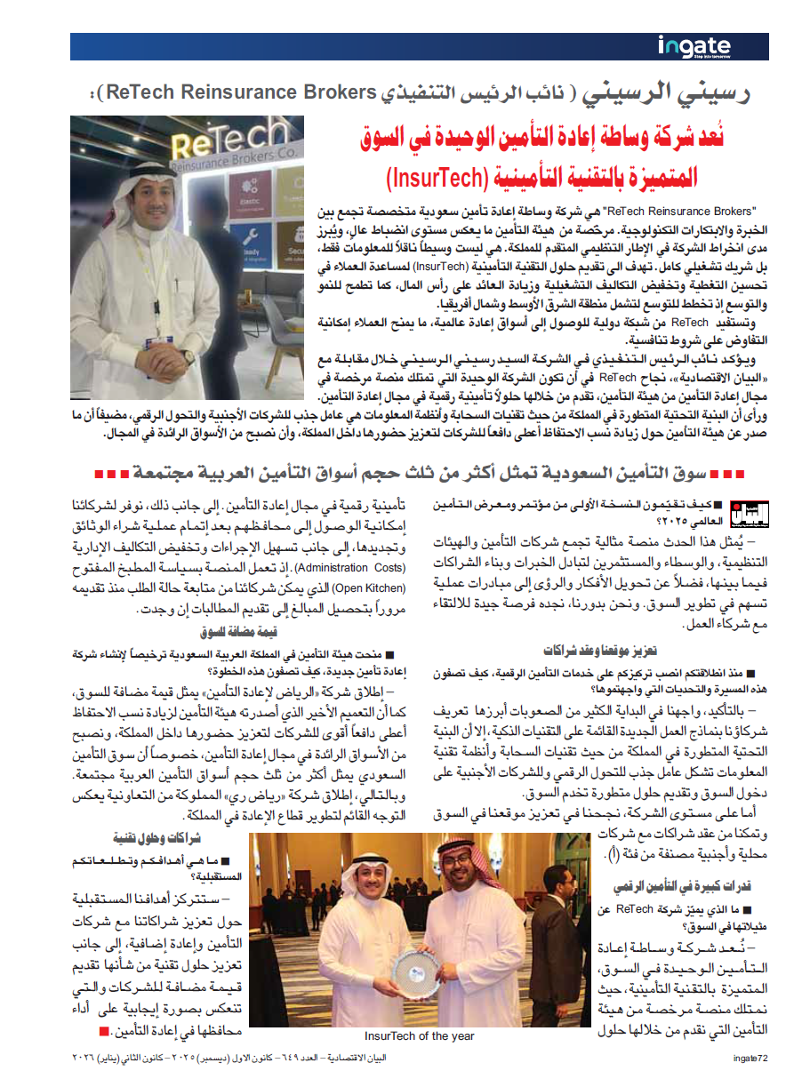 In an interview with Al Bayan, ReTech’s Deputy CEO, Mr. Resini Al-Resini, highlighted the company’s success in becoming the only reinsurance broker to operate a licensed platform approved by the Insurance Authority, through which it delivers digital reinsurance solutions. He emphasized that Saudi Arabia’s advanced infrastructure—particularly in cloud technologies and information systems—serves as a major attraction for foreign companies and supports digital transformation. He also noted that recent directives issued by the Insurance Authority to increase retention ratios have encouraged companies to strengthen their presence within the Kingdom, positioning Saudi Arabia as one of the leading markets in the sector.
